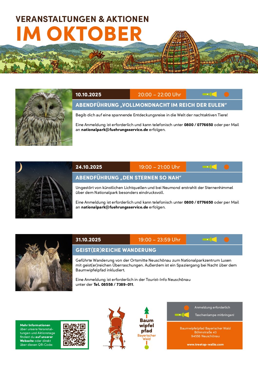 Nehmen Sie doch an einer der täglichen Führungen über den Baumwipfelpfad teil – geschulte Waldführer nehmen Sie mit auf einen Spaziergang über den Pfad und geben Ihnen interessante Informationen zu Natur, Nationalpark und zum Wipfelweg.